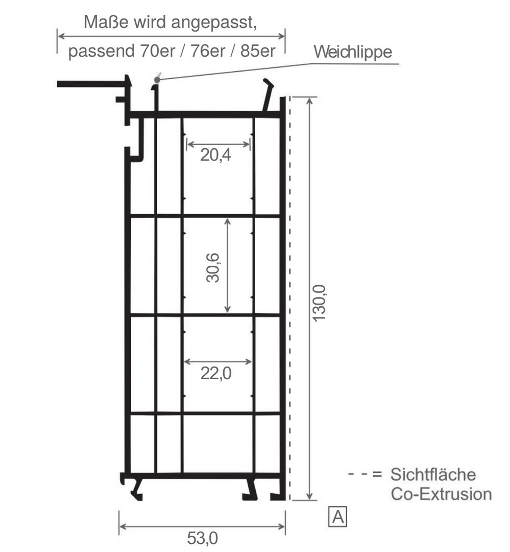 Aluplast-Bodeneinstand 130 mm Lg. 6,00 m Weiß, mit WL, mittlere Kammer ausgeschäumt für 76er, VE: 12 m