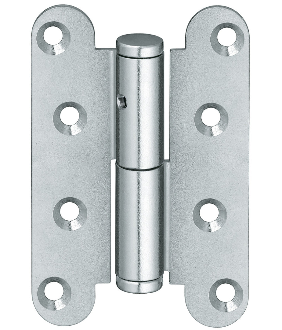 Für stumpf einschlagende Türen mit Blendrahmen, abgerundete Schenkel, Lappen auf Mitte, mit Senklöcher zum Aufschrauben und festem Stift, Länge 100 mm, Stift-Ø 10 mm. Schrauben-Ø 4,5 mm.