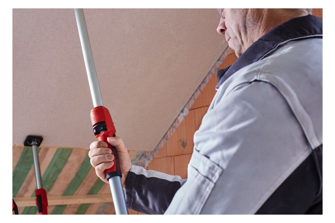 durch die Fixierung in drei Schritten: Zum Voreinstellen der Deckenstütze wird die Lösetaste betätigt und das teleskopierbare Innenrohr auf die gewünschte Länge ausgezogen. Die Feineinstellung erfolgt durch Betätigen des Pumphebels bis die Anlageplatte der Stütze am Werkstück anliegt. Anschließend solange am Griff im Uhrzeigersinn drehen bis die gewünschte Haltekraft erreicht ist (max. Belastbarkeit beachten)