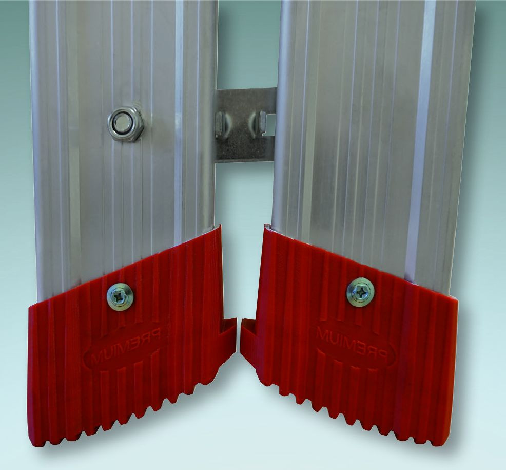 - Premium-Gummifuß mit Abstandsnocke und größerer Auflagefläche für einen sicheren Stand und zur Verhinderung von Holmbeschädigungen beim Zusammenklappen der Leiter