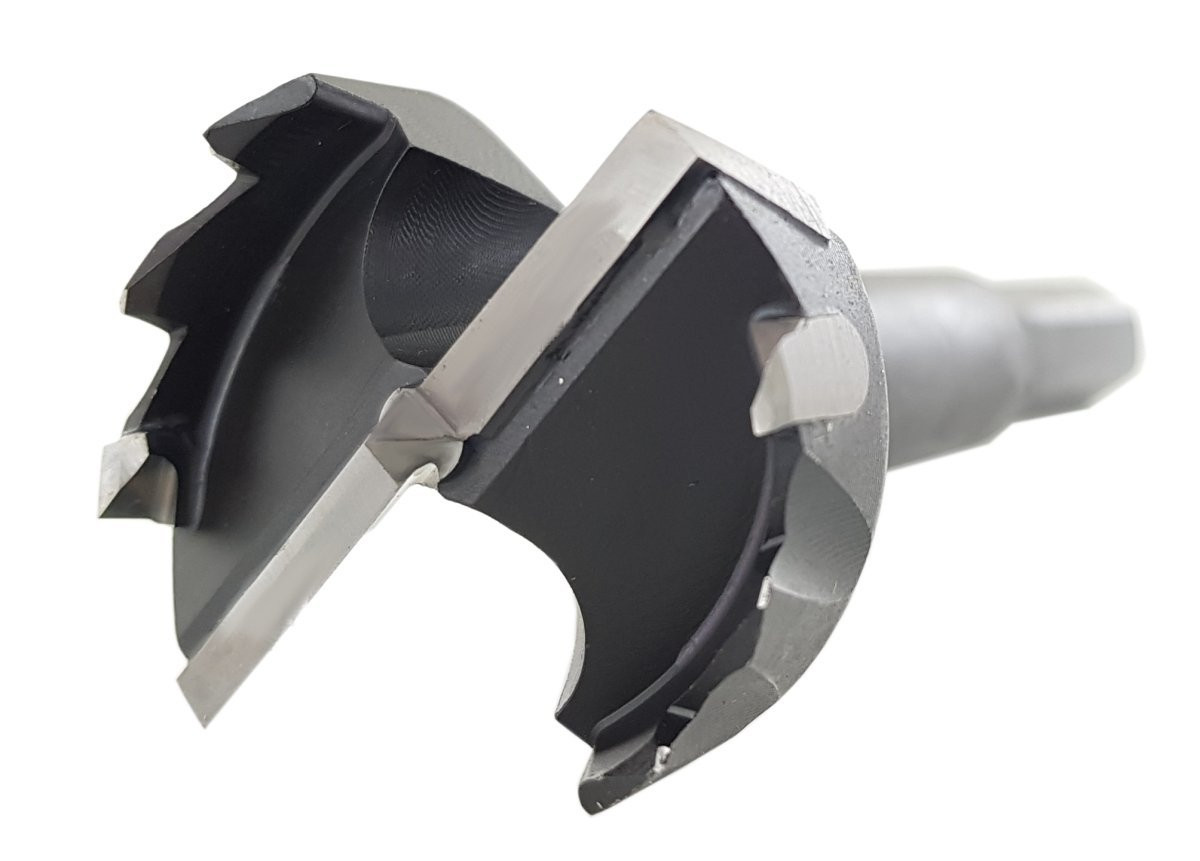 - Erster HM-bestückter Forstnerbohrer mit Zentrierspitze, HM-Hauptschneide und HM-bestückter, gezahnter Umfangschneide