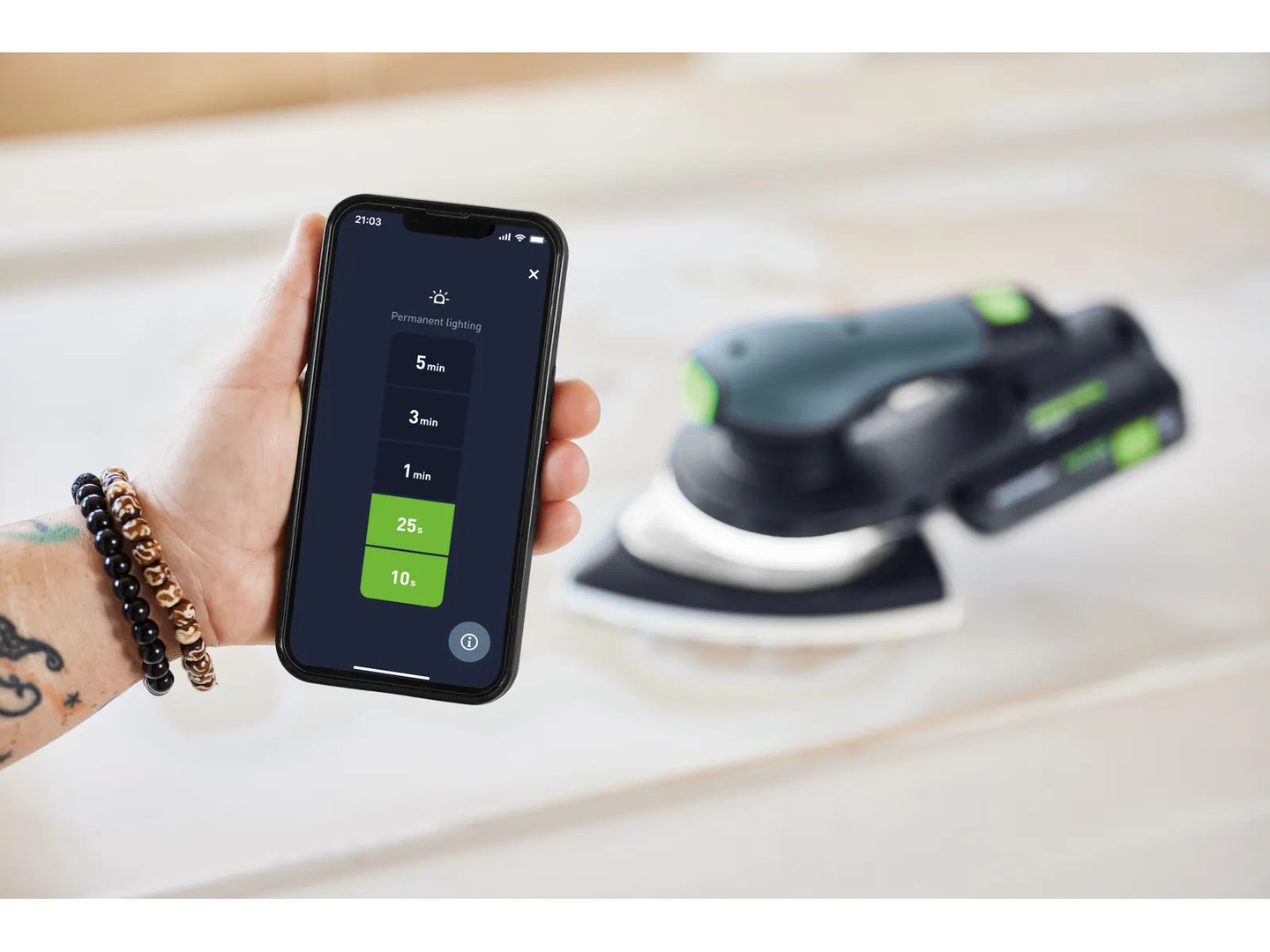 - Mehr Funktionen mit der Festool App: Mit deinem Smartphone kannst du das Licht individuell stufenlos dimmen und die Leuchtdauer einstellen - so kannst du die Oberfläche nach dem Schleifen noch einmal prüfen