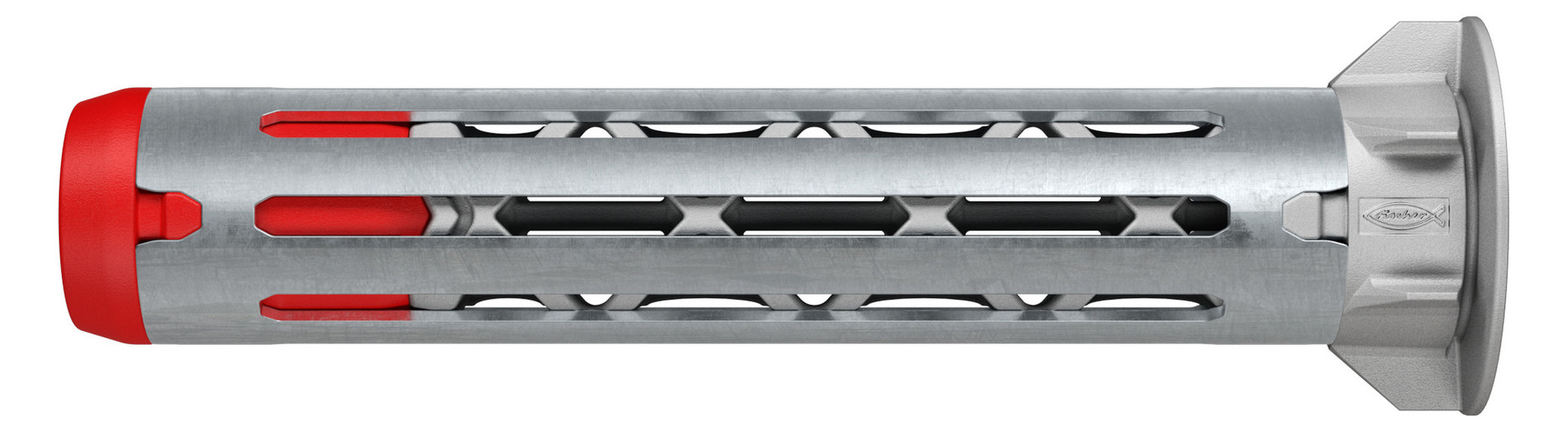 - Die einzigartige 2-Komponenten-Technologie erfüllt hohe Lastanforderungen. Die Metallhülse presst sich an die Plattenrückwand und der Nylon-Grundkörper verspreizt sich im Baustoff.