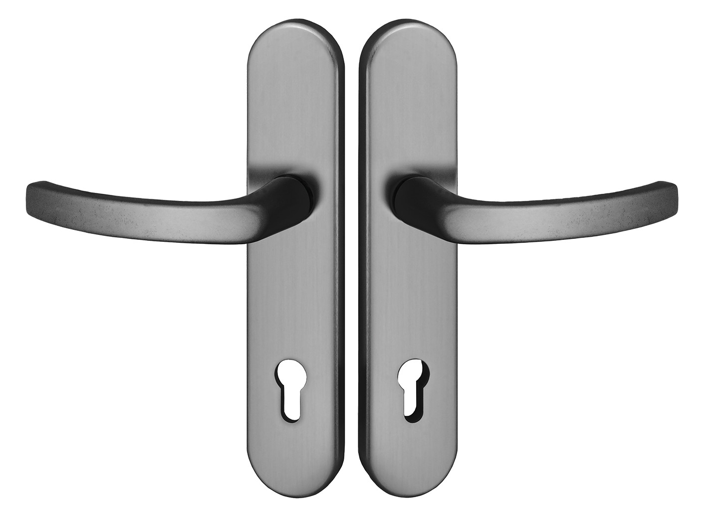Schutzgarnitur bestehend aus Griff 2200, Außenschild mit Stahlgewinde M6 und gehärteter Stahlunterkonstruktion, Innenschild mit Rückholfeder, beide Schilder abgedeckt mit ovalen Kappen, Verschraubung mit hochfesten Schrauben M6, 8mm Vierkant