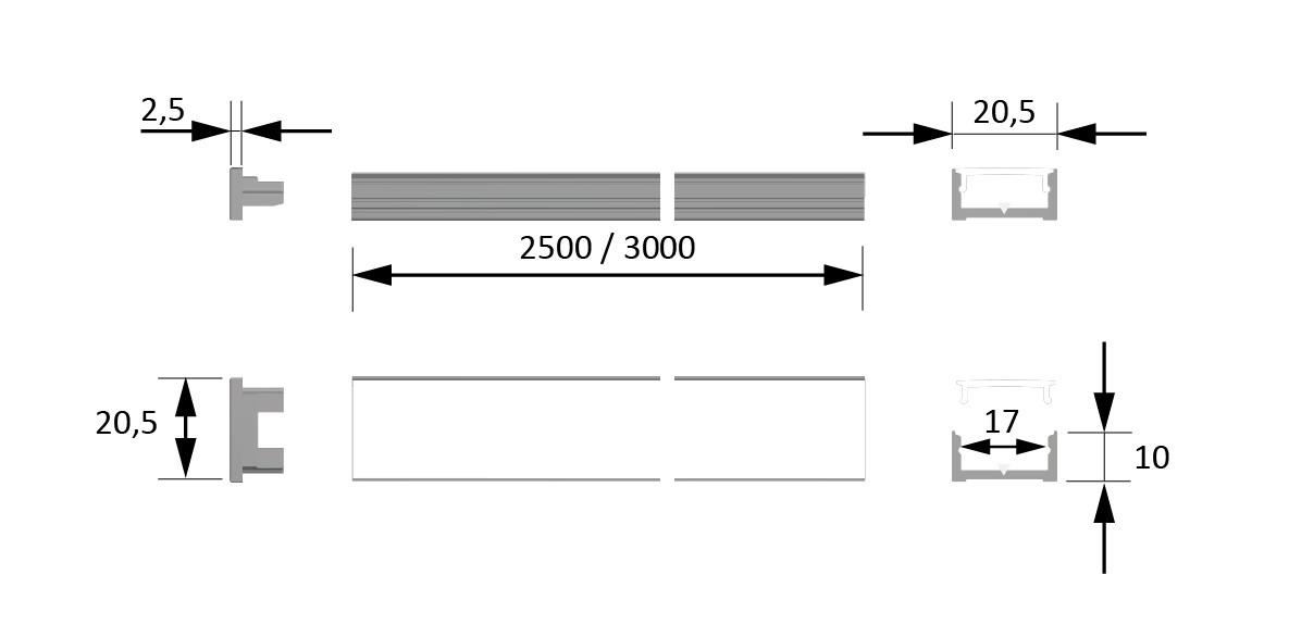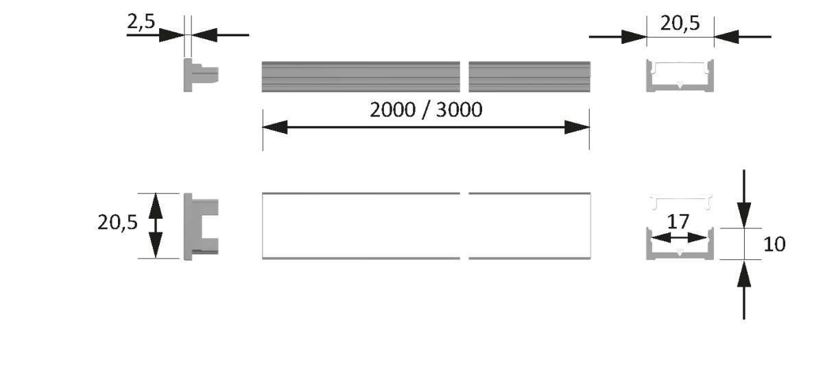Ausführung 2500 mm, Alu/ Opal