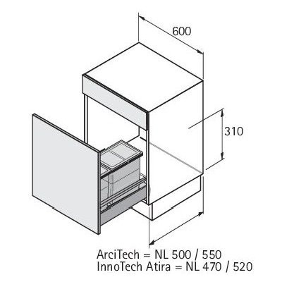 Nennlänge (NL) 500 / 550 mm oder für InnoTech Atira, Nennlänge (NL) 470 / 520 mm - Für Schrankbreite 600 mm