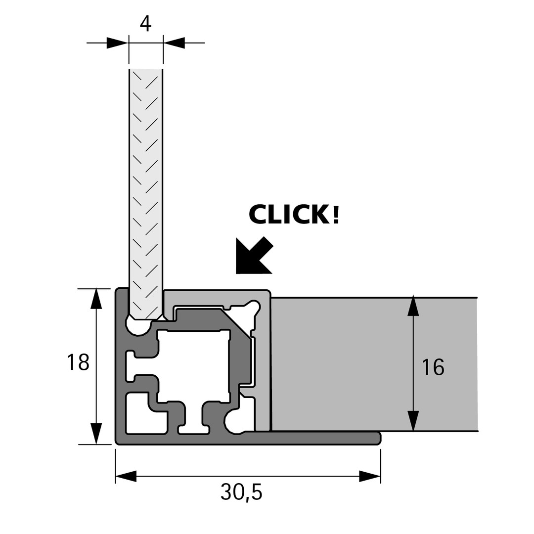 • Profil zur Aufnahme von einem 4 mm Glaselement (ESG Sicherheitsglas) und einem 16 mm Boden (anschraubbar)