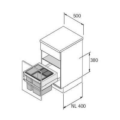 • Oben laufendes Abfallsystem für ArciTech Frontauszüge, Systemhöhe 186 mm, Zargenhöhe 94 mm, Nennlänge (NL) 400 oder 500 mm