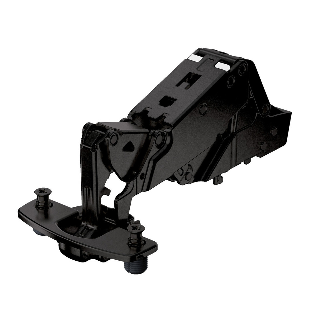 Hettich Sensys Weitwinkelscharnier, mit Null-Einsprung, mit integrierter Dämpfung (Sensys 8657i), in obsidianschwarz, halb vorliegend, Öffnungswinkel 165°, TH-Bohrbild 52 x 5,5 mm, mit Spreizmuffen (ø 10 x 11)