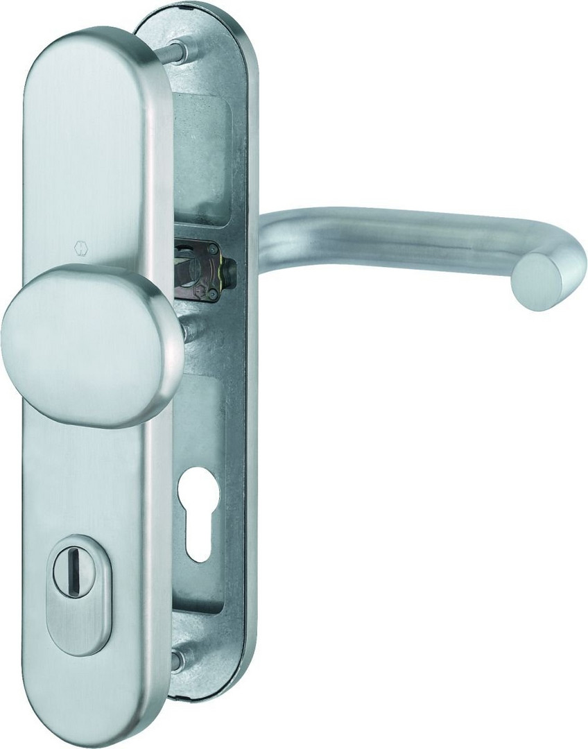 - Lagerung: außen gekröpfter Knopf fest, ummontierbar; innen Türgriff lose, Rückholfeder rechts/links verwendbar, wartungsfreies Gleitlager