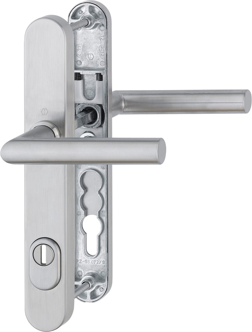 HOPPE-Edelstahl-Schutz-Schmalschild-Türgriff-Garnitur mit Zylinder-Abdeckung für Profiltüren:
