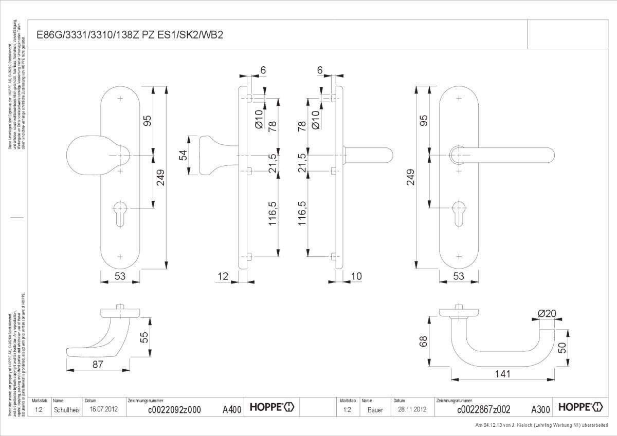 - Lagerung: außen gekröpfter Knopf fest, ummontierbar; innen Türgriff lose, Rückholfeder rechts/links verwendbar, wartungsfreies Gleitlager