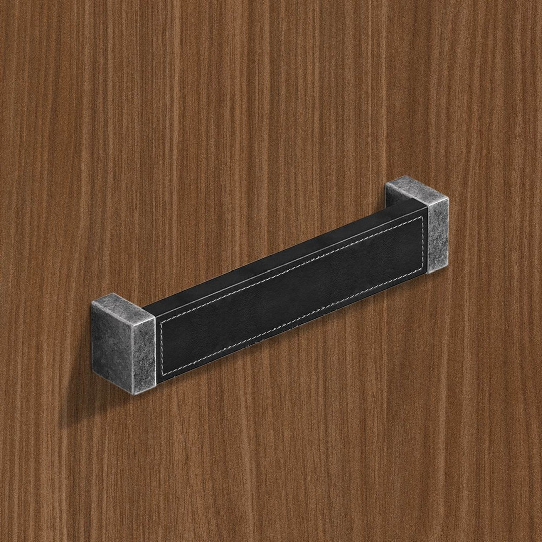 Griff Arago, Bohrabstand 192, L 208 mm, B 40 mm, H 33 mm, Leder schwarzgrau / Zinn Optik antik