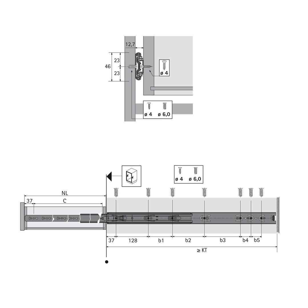 Hettich Kugelauszug KA 5632, Seitenmontage, Abmessungen (H x B) 46 x 12,7 mm, 350 mm, schwarz