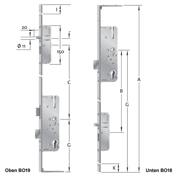 Bestehend aus 2 Verschlüssen mit schlüsselbetätigtem Getriebe, vorgerichtet für PZ, oberer Verschluss mit Wechsel, alle Kästen geschlossen und verzinkt, DIN links und DIN rechts verwendbar durch umstellbare Falle, Stulpausführung: Flachstulp, hell verzinkt, 10 mm Nuss, Entfernung 92 mm, mit Rundbolzen.