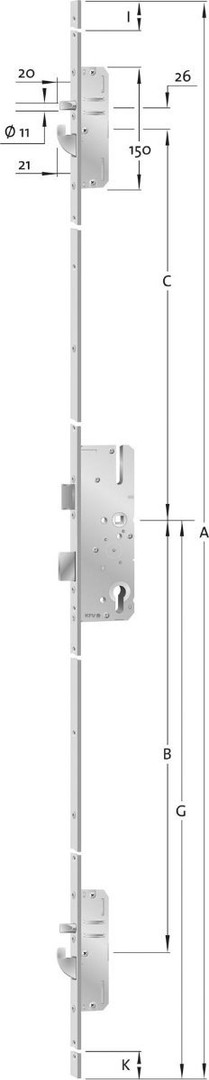 Mit kombinierter Rundbolzen-Schwenkriegel-Arretierung, Langstulp 2170 mm mit Hauptschloss und 2 Zusatzschlössern, Hauptschloss vorgerichtet für PZ, Entfernung 92 mm, 10 mm Nuss, DIN links und rechts umstellbar. Stulp hell verzinkt. Ausführung TSH mit Türsperre.