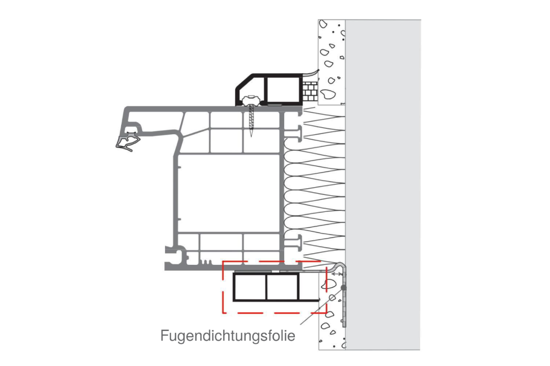 Das Kammerprofil wird im Innenbereich an das Mauerwerk angelegt und auf dem Blendrahmen verklebt.