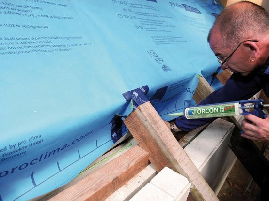 Einsatz als bewitterbare Luftdichtungsbahn für die Dachsanierung von außen bei Volldämmung des bestehenden Sparrengefachs. Verlegung über den Sparren unter einer zusätzlichen Aufsparrendämmung aus Holzfaserunterdeckplatten im Rahmen der Sanierungslösungen von pro clima, sowie für die freigegebenen Sanierungslösungen von Holzfaserplattenherstellern.