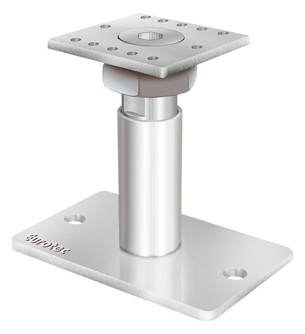 Eurotec Stützenfuß PediX erfüllt die Anforderungen des konstruktiven Holzschutzes und zeichnet sich durch seine hohe Zug- und Drucktragfähigkeit aus. Darüber hinaus kann der neue PediX 140+50 zusätzlich Horizontallasten aufnehmen. Der Stützenfuß kann ohne weitere Abbundarbeiten und Vorbohren mit Vollgewindeschrauben auf das Hirnholz montiert werden. Vor eindringender Nässe schützt eine EPDM-Dichtung zwischen Stütze und Stützenfuß. Der PediX ist auch nach der Montage weiterhin bis zu 50, 100 oder 150 mm höhenverstellbar, dies ermöglicht den Ausgleich von Fertigungstoleranzen und die nachträgliche Setzung der Einzelfundamente.
