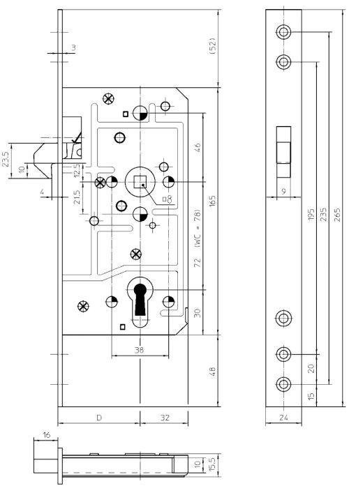 Schiebetürschloß mit Hakenfalle Dornmaß 65 mm