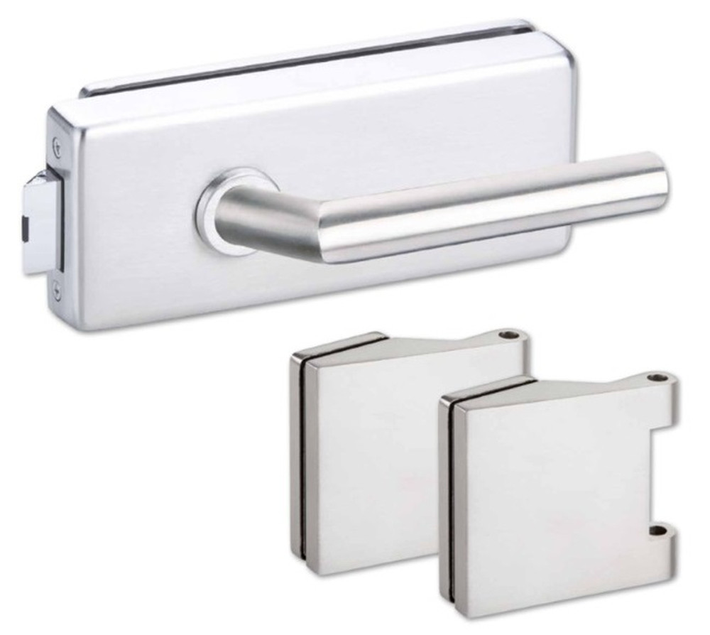 TOPFORM Glastür Beschlag-Set Dokos - Edelstahlfarben - ohne Lochung - Bandpaar, Schloss, Drückerpaar und Rahmenteile