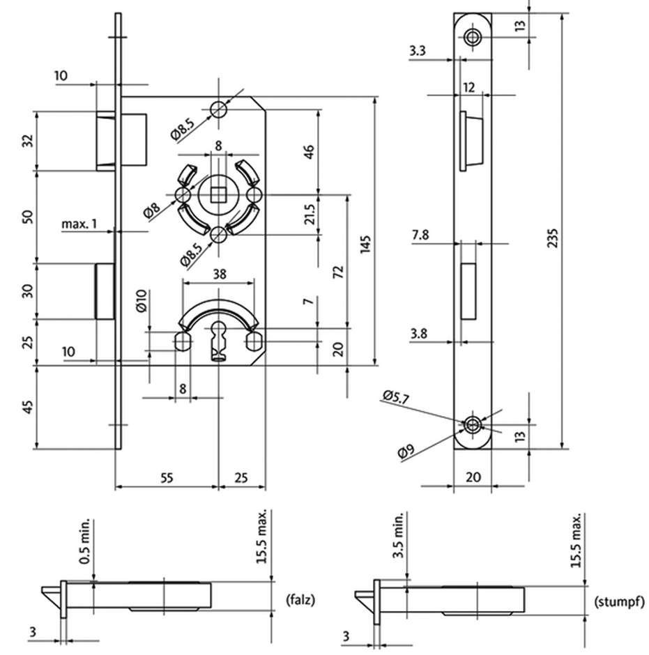 TOPFORM ZT-Schloss gefälzt 55/78/8mm Links (KL. 1) WC, käntig silber