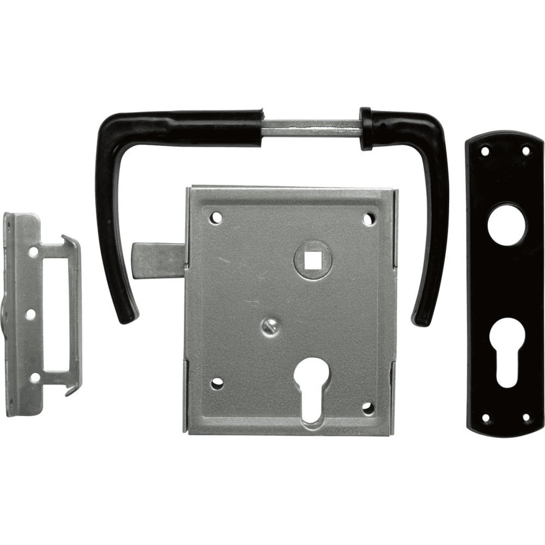 Mit hebender Falle, Ausführung BB mit Nachtriegel, rechts/links verwendbar, verzinkt, mit Drückergarnitur und Schild.
