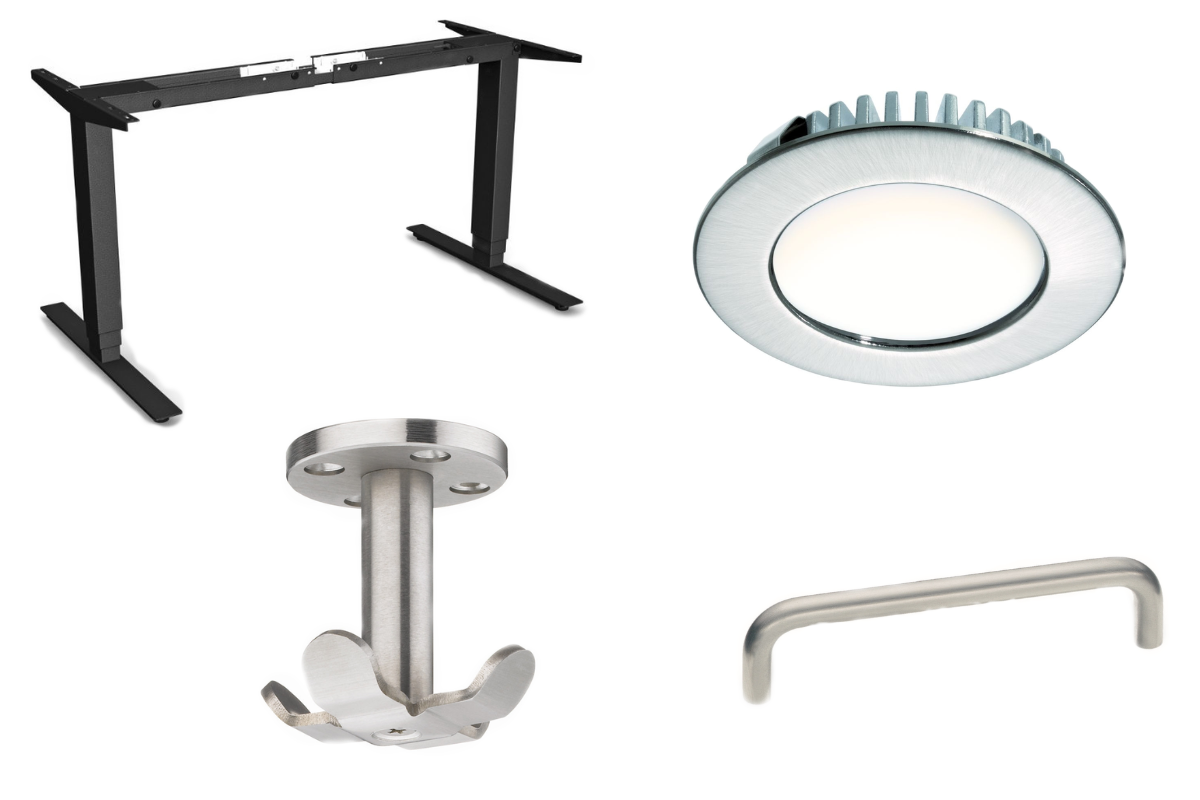 Falls deiner Ausstattung noch etwas fehlt, kannst du dein Vorhaben mit den passenden Beschlägen von TOPFORM perfekt ergänzen, ob es sich um die Innenausstattung im Schlafzimmer, wie Tischbeine oder Schrankrohre handelt oder auch Zierbeschläge wie verschiedene Knöpfe, Relinggriffe, Segmentbogengriffe oder andere Möbelgriffe findest du bei uns. Des weiteren bieten wir Lichtsysteme, Tischgestelle und Tischbeine mit passendem Zubehör an. Auf unserer Seite Tischgestelle und Beleuchtungen findest du weitere Informationen und Produkte, die dich interessieren können.